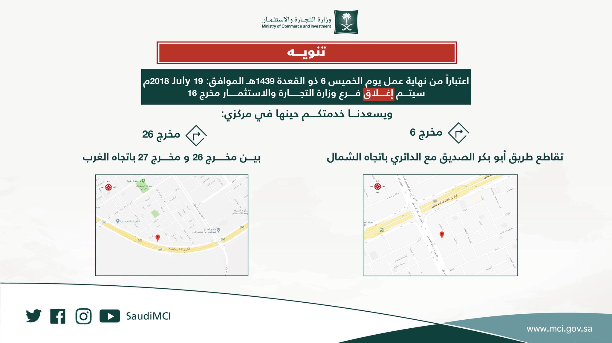O Xrhsths وزارة التجارة Sto Twitter تنويه اعتبارا من اليوم الأحد سيتم إغلاق فرع وزارة التجارة والاستثمار بمخرج 16